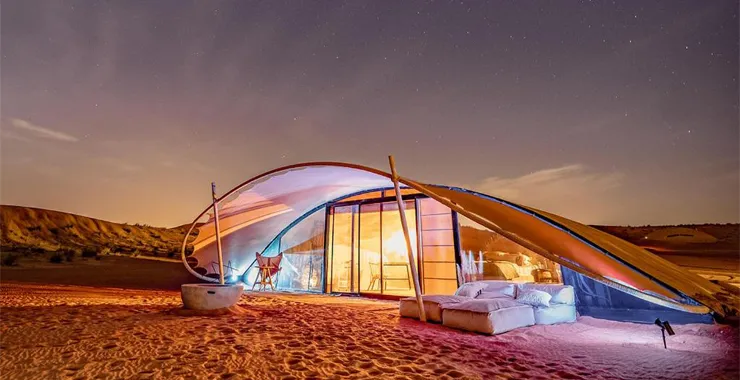 Immerse yourself in the secluded atmosphere of the Dubai desert with an exclusive stay at The Nest by Sonara. This unique camp offers a desert night with dinner and breakfast included, combining comfort, luxury, and romance under the starry sky.
