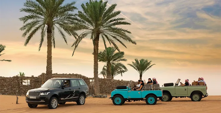 A premium Land Rover Defender awaits you, with plush seats, a smooth ride, and stunning desert landscapes lit by the sunset.