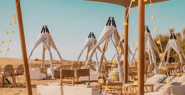 Discover the magic of the Arabian desert with the "Sonara Camp – The Sunset and Dinner Experience." Begin with a breathtaking safari across the golden dunes, enjoying the wind and sand, and take stunning photos against the backdrop of endless dunes and a vibrant sunset.