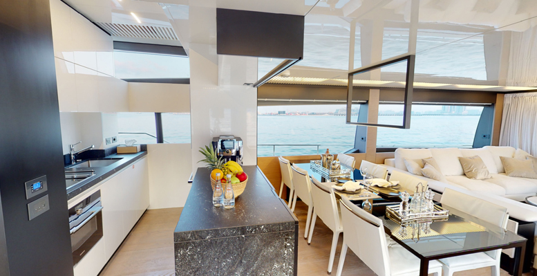 На этой яхте есть множество открытых пространств, что особенно актуально для Дубая, но в то же время здесь сразу 4 каюты, которые обеспеспечивают 8 спальных мест. Комфорту пассажиров уделено особое внимание, так как сама яхта Ferretti 780 изначально проектировалаь для длительных морских прогулок.